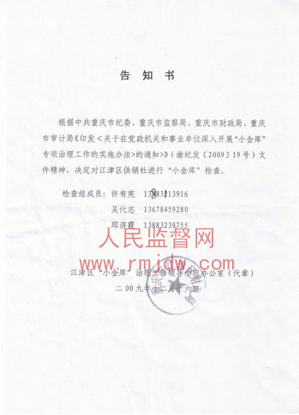 图:江津区“小金库”治理工作领导小组办公室告知书