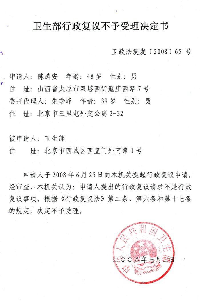 2008年7月3日,人民监督网传媒集团总裁、《人民监督网》主编朱瑞峰先生接到卫生部的电话通知,到中华人民共和国卫生部领取行政复议决定书。朱瑞峰先生拿到卫生部的“行政复议不予受理决定书”后,对前来采访的众媒体说:“卫生部不予受理行政复议,在我的预料之中。卫生部受理或不受理都是中国公民的胜利。”