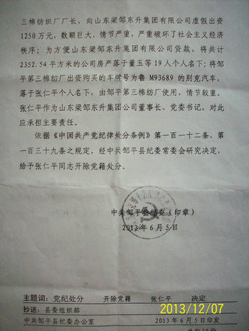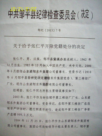 但在对张仁平的“处分决定”中,纪检委却只字不提张仁平在执政期间担任东关村村支部书记一事。从这里不难看出邹平县纪检委是在极力掩盖张仁平村支部书记这一身份主体,其目的就是让张仁平逃避法律的追究。