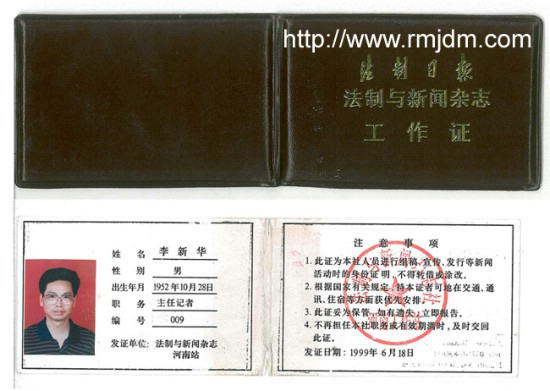 据知情人提供的证据,李新华于1999年就私刻《法制与新闻杂志河南工作站》的公章及钢印,并印制“法制日报法制与新闻杂志工作证”证件塑料封皮,制作假证。这几年一直拿着此证件冒充《法制日报》记者进行非法活动。