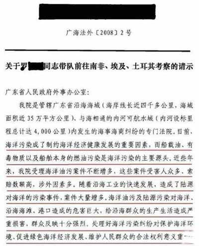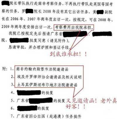 6月3日,有网友在某论坛发帖称,最近收到一封未署名的邮件,内容是反映广州某法院领导编造理由赴南非等四国考察并在考察结束后在向上级递交的考察报告中弄虚作假等问题。帖子包括10余张扫描文件,这些文件包括向广东省政府外事办公室的请示文件、赴南非等国考察访问报告及该单位网上工作平台的交流记录等三部分。网友对文件中涉及人名的地方大都作了遮蔽处理。