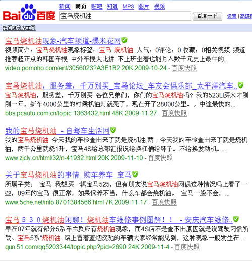 在我们的电话采访中,大多数车主表示自己的宝马车有烧机油的状况出现,并且没有得到宝马和4S店的妥善解决。黄鑫(化名),是爱卡论坛的资深网友,他为了筹备婚礼,于08年12月底在北京购买了一辆宝马523LI车型,在行驶至大约5800公里的时候就提示机油不足,而这位车主在4S店却得到了“正常现象”的答复。之后的二次保养中,4S店建议这位车主采用了一款更贵的全合成机油,但烧机油情况依旧。在这位车主不断寻求解决办法后,4S店表示可以先进行机油称量。但是这一测试耗费时间长,并且必须要到一些大城市的4S点才可以做,对于一些宝马车主来说,这简直是一个不可能完成的任务。
