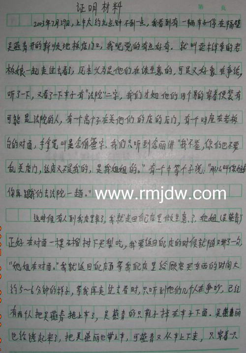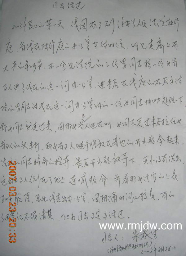 他们法官把我带到看守所,姚春妹站在我后面,看守所民警吴国友看我脸上身上都是伤就问我身上的伤是哪来的,我看了一下姚春妹,含着眼泪违心地说是自己碰掉的,他叫我写上去。胡国友说我是女的,要是男的就把我的衣服脱掉检查一下。这时姚春妹走开了,我就问胡国友可不可以翻供,我说是他们打的。他说可以的,我就把前面写的撕掉,我刚要写,有人说:你头脑清醒一点,我们判你二年是轻而易举的事情。我就不敢写是他们打的了。