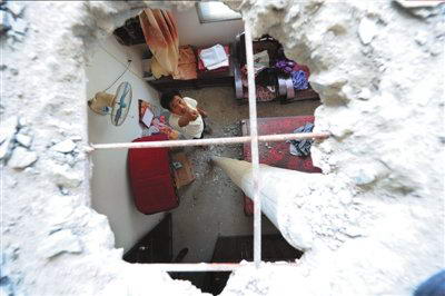居民刘成旺在安置房里指着屋顶脸盆大小的窟窿(7月25日摄)。新华社发