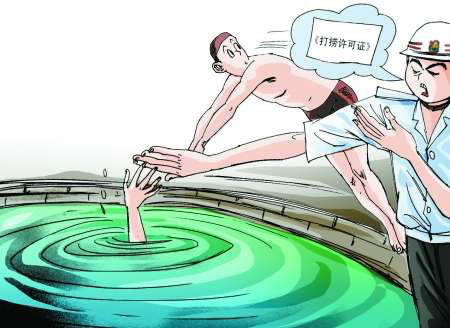 漫画/王伟宾 河南郑州:巡防队员阻止公益组织下水打捞溺水市民 据中国之声《新闻晚高峰》报道,见义勇为本是社会提倡的美德,然而最近在河南郑州却发生了想要见义勇为却遭到管理方阻拦的稀奇事。 一名市民在郑州郑东新区如意湖溺水,当地一个公益团体郑州市水上义务搜救队东区队长牛振西带人赶到现场施救,却遭到了巡防队员的阻止,他们要求牛振西必须出示“打捞许可证”,否则不能下水。最终,溺水市民抢救无效死亡,而“打捞许可证”说法竟是子虚乌有。 8月4日下午4时许,郑州市水上义务搜救队东区队长牛振西接到来自郑东新区河道管理方打来的求救电话,说郑东新区运河西码头有人溺水,请他去帮忙参与救援。牛振西马上给其他队员们发短信要求赶到事发现场,随后自己带上泳衣泳帽也来到郑东新区如意湖畔。 牛振西和已经赶到的队员们准备下水参与救援时,却遭到了巡防队员们的阻止。 牛振西:他们(巡防队员)说,经过谁允许了在这救人?经过谁批准了?正在给领导联系,不让(义务搜救队)下水,和领导沟通了一个多小时,他就不让下水(救人)。 时间一分一秒地过去,而岸上准备就绪的郑州市水上义务搜救队却一直没能下水。而原因就在于他们拿不出巡防队员所说的“打捞许可证”。牛振西说,当时队员们和周围的市民都很着急,还有不少队员失望而去。 牛振西:僵持到义务搜救队队员走了三分之二。家属非常失望,想要下水,但不会水。他要是会水,也不会等这么长时间,不下水去找。干警帮我们阻拦着他(家属)不让他下。在这种情况下,我们才下水。很快,6分钟就打捞(溺水者遗体)上来了。一个来回就把他带出来,但他们(巡防队员)的人说里面不可能有。 牛振西所在的郑州市水上义务搜救队是什么样一个组织呢?据记者了解,这是市冬泳协会2005年成立的民间公益性组织,此前曾参与多次救援行动。