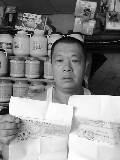 云南省罗平县九龙农贸市场粮油经营户陈家德展示去年交纳的罚款和会费。他说,因为不识字,没有做台账,被罚款500元,自己一人看守店面,却按两个人头缴纳“个私协”会费80元。本报记者 雷成摄