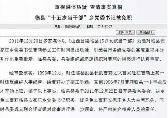 • 山西临县“15岁当干部”乡党委书记被免职