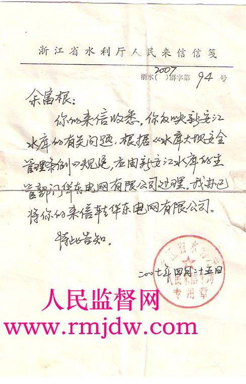 (3)前坞村的余富根,工业园区强行挖掉他的土地,也没有付一分钱,余富根没有办法阻止工地老板挖农田,因在余富根家里,村长吴顺发为他说了一句公道话:“挖掉的土地确实没付钱”,但却遭到一批流氓恶棍的拳打脚踢,把吴顺发打成轻伤,住院50多天才好。另外把余富根的价值十几万元的货船强行报废,一分钱不赔。余富根为上访把船抵押给别人,无处可住、流落街头,乞讨为生。第一次在2006年10月10日到北京上访,被浙江省办事处抓住,然后淳安县千岛湖镇董××、信访局王××、前坞村书记吴××去北京把我带回淳安。第二次,2007年1月5日到北京中央信访局48号接待室,他们材料都不看,叫我到省里去。2月15日余富根到中央水利部上访,他们却不收材料说:“中央不管水库”,2月25日余富根再次到中央水利部及中央国土部信访局,但他们始终不收材料。第三次2007年7月10日,余富根又一次到北京中央水利部,但它们还是不收材料。2008年余富根把劈山填湖的有关资料寄到中央建设部、水利部监督科及中央检察院也毫无结果,余富根为阻止园区非法劈山填湖,从县到市、省相关部门全部跑遍,但他们都互相推诿,此事毫无结果,甚至到华东电力公司但得到的答复是他们是企业管不了水库。据余富根调查所知,淳安县工业用地30公顷,范围365平方公里(全水域)却上报还不到四分之一,对上报,地方政府是按国家相关政策给征用土地的百姓如何安置,对园区开发经过中央批准同意开发的,要他们拿出文件向百姓公开,他们却不同意,实际就是弄虚作假、欺上瞒下。关于上告一事,2007年八月中旬县委王主任、县委徐秘书说你是淳安的公民,为什么把淳安告倒。我问千岛湖镇书记王昌迪农民承包的土地自己有没有自由权,得到的答复是土地是集体的农民无权作主,反而要我滚出去。陈志华副镇长找我谈话,叫我不要上告,但就是不给老百姓解决问题。本人原来开船维生,船也被强行停开,为了维护自己的权益,上下跑来跑去,化光所有集蓄不算,到处借帐,本人现无家可归,借住朋友船上,过着非人生活。本人到处上告,到过国家信访局、水利部、国土资源部、以及省市有关部门,但至今没有处理。上访材料寄遍各有关部门,都在推卸责任。