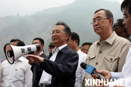 这是他第二次来到地震破坏的现场,不过他的客人、联合国秘书长潘基文是第一次来。温家宝显然决定将拘谨的外交礼节抛在一边。
