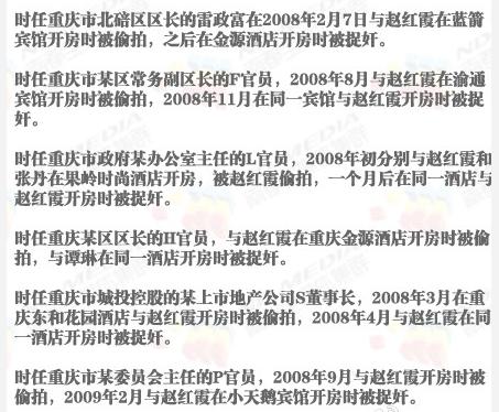 根据南都记者掌握的证据,时任重庆市北碚区区长的雷政富在2008年2月7日与赵红霞在蓝箭宾馆开房时被偷拍,之后在金源酒店开房时被捉奸。时任重庆市某区常务副区长的F官员,2008年8月与赵红霞在渝通宾馆开房时被偷拍,2008年11月在同一宾馆与赵红霞开房时被捉奸。时任重庆市政府某办公室主任的L官员,2008年初分别与赵红霞和张丹在果岭时尚酒店开房,被赵红霞偷拍,一个月后在同一酒店与赵红霞开房时被捉奸。时任重庆某区区长的H官员,与赵红霞在重庆金源酒店开房时被偷拍,与谭琳在同一酒店开房时被捉奸。时任重庆市城投控股的某上市地产公司S董事长,2008年3月在重庆东和花园酒店与赵红霞开房时被偷拍,2008年4月与赵红霞在同一酒店开房时被捉奸。时任重庆市某委员会主任的P官员,2008年9月与赵红霞开房时被偷拍,2009年2月与赵红霞在小天鹅宾馆开房时被捉奸。