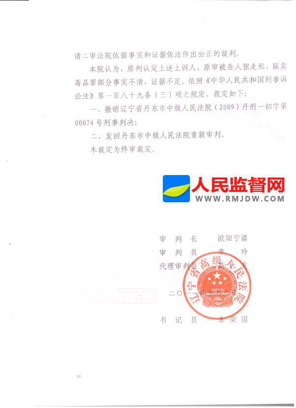201156日,辽宁省高级人民法院下达(2010)辽刑四终字第27号刑事裁定书。撤销丹东市中级人民法院(2009)丹刑一初字第00074号一审刑事判决书,发回丹东市中级人民法院重新审理。