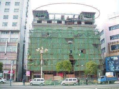 在大楼隔壁工作的张先生告诉记者,正在施工的大楼名叫“正宏基宾馆”,建成已近10年,数年前整幢大楼卖给一名周姓老板。本来大楼楼顶有一个“假层”,两个月前,周老板在对“假层”进行改造的基础上,又加了一层。张先生担心,由于大楼已近10年,随便“加层”很可能引起安全隐患,也可能会殃及左邻右舍。正在大楼地面施工现场的一名男子称,大楼楼顶的“翻新”,是从两个月前开始的,准备在春节前完工,至于“翻新”施工有没有手续,他表示“不清楚”。