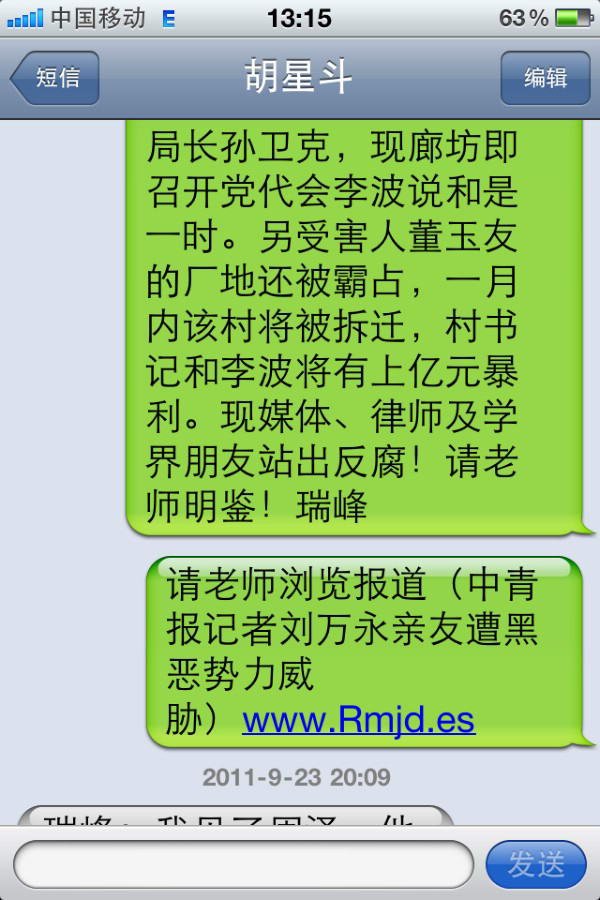 三、20119161823分,胡星斗教授发来手机短信:瑞峰:我的多年好友、原《瞭望》副主编、现北大一个研究院副院长刘东昌教授的亲戚正是那个廊坊秘书长,刘多次找我求情,希望能删除你网站上的帖子。刘与张祖桦、茅于轼都熟,属于我们圈子里的朋友。廊坊方面表示当初性急说了不该说的话,他们绝不会抓捕你的。我认为冤家宜解不宜结,他们既然认错了,你也就得胜收兵吧。也是给我一个面子,我好向朋友交代了。你悄悄撤掉帖子吧,不要声张,给对方一点面子,以上内容都不要上网。下次我们与刘教授见一面,他在北外也兼职带硕士研究生,他跟圈内的民主朋友都很熟。谢谢你,胡