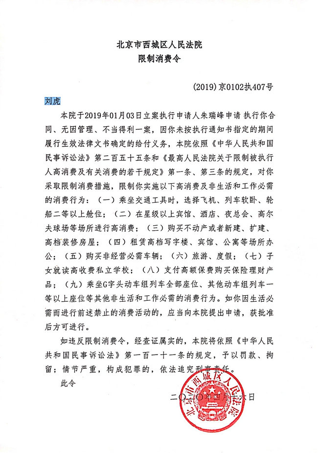 图:北京市西城区人民法院依法给刘虎下达限制消费令