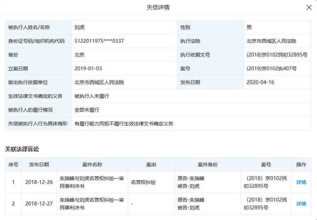 2020年4月16日,北京市西城区人民法院依法将刘虎列入失信被执行人名单,并下达限制消费令。刘虎成为被北京市多家法院执行的资深“小赖”。