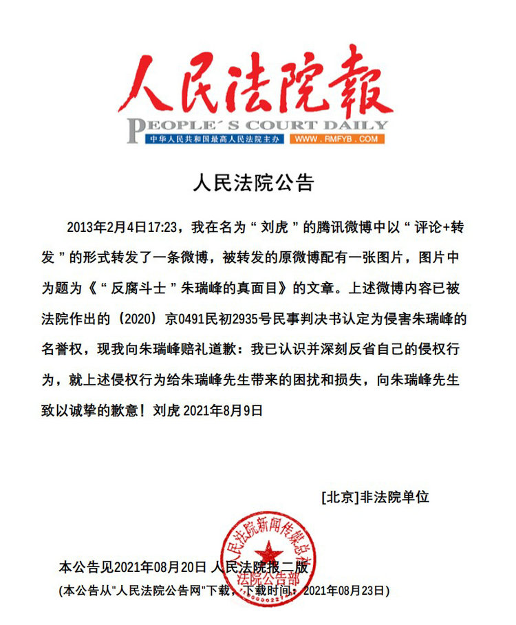 法院作出的(2020)京0491民初2935号民事判决书认定为侵害朱瑞峰的名誉权,现我向朱瑞峰赔礼道歉:我已认识并深刻反省自己的侵权行为,就上述侵权行为给朱瑞峰先生带来的困扰和损失,向朱瑞峰先生致以诚挚的歉意!