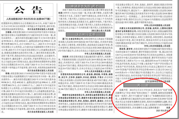 本公告见2021年08月20日 人民法院报二版  http://rmfyb.chinacourt.org/paper/html/2021-08/20/node_3.htm