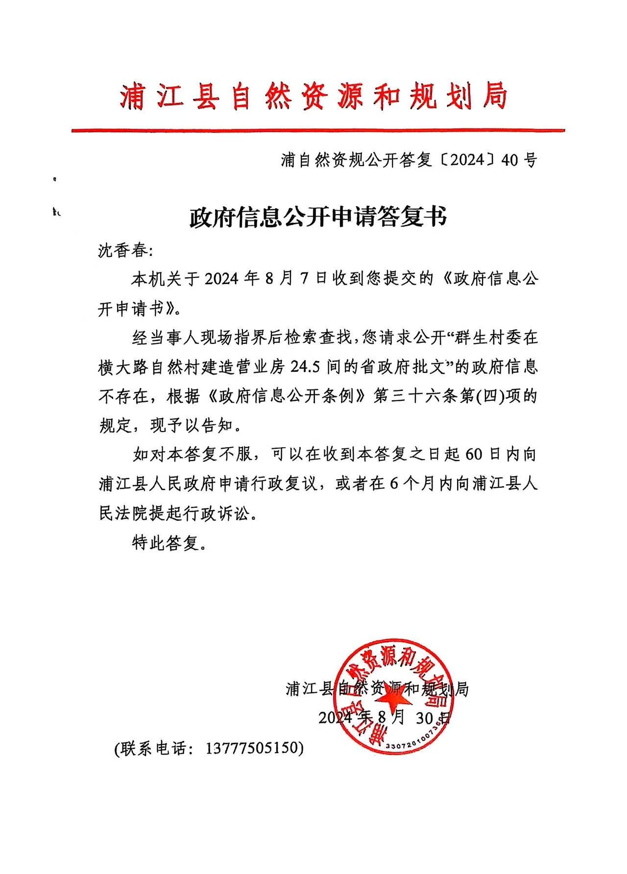 二、第二份是浦江县人民政府浦阳街道办事处2024年11月18日第4号政府信息公开答复书。沈香春,你提交的群生村委在横大路自然村建造营业房24.5间,有无向浦阳街道办理建房审批手续?群生村委在2013年拆除陈逢坑自然村两幢房子,2018年又拆后重建(其中D号楼2013年造到3层,2018年又扩建加高,E号楼12套房子拆后重建,有无办理报批手续?)