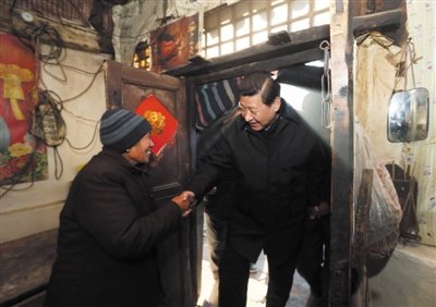2012年12月30日,河北省阜平县龙泉关镇骆驼湾村,习近平到困难群众唐荣斌家看望。新华社记者 兰红光 摄