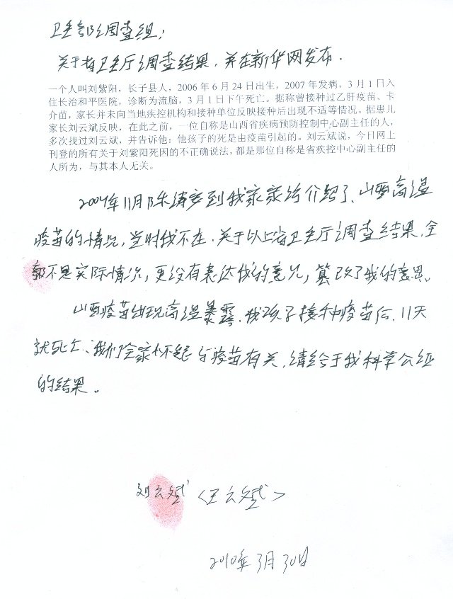 然而,该报道刊发的第13天,即3月31日,居住在深山沟里的刘云斌才在太原迎泽宾馆第一次见到“疫苗事件调查组”人员、第一次看到3月23日由山西省预防接种异常反应调查诊断专家组出具的《关于网络报道15名儿童的基本结论》、第一次得知自己的孩子刘紫阳已经被鉴定为:死亡与疫苗无关。