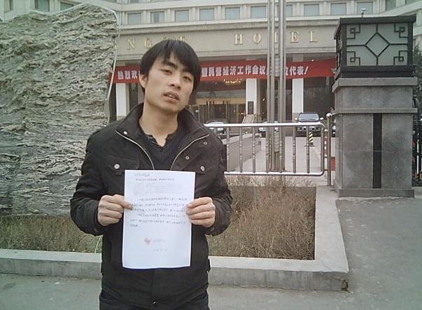 下图:刘紫阳的爸爸刘云斌在迎泽宾馆门前说:“卫生部和山西省专家都在欺骗我们!”