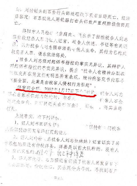 我儿刘志强与2002年元月7日,因石金行在我家承包地里挖洋姜,我儿上前制止,发生口角。我儿用锄头朝石金行头部打下去,将人打死。我儿刘志强患有精神分裂症(有司法鉴定为证)。然而,洛阳市中级法院不顾事实真相,在审判过程中根本不让我方人员讲话,更不采纳我方律师申辩。对精神病的司法鉴定暗箱操作,根本不让我方律师看。对我方证人像对待犯人一样。