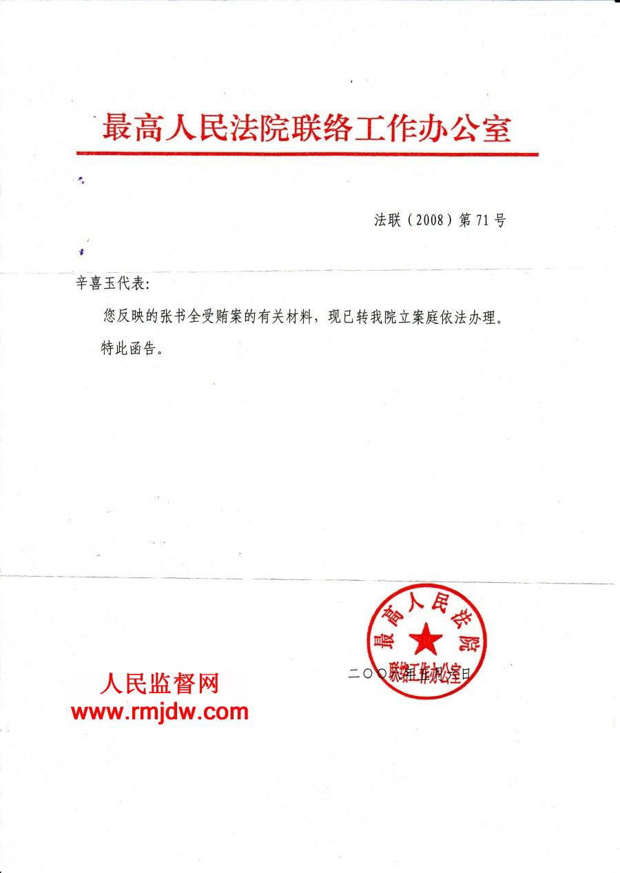 辛喜玉代表又说,张拨元为了报复诬陷他人之目的,竟然捏造虚假的犯罪事实向司法机关恶意告发,造成了极坏的社会影响和严重后果,即损害了司法机关的形象,也严重侵犯了公民的人身权利,我认为张书全受贿案存在大量的疑点,司法机关应该根据法律规定,作出证据不足,被指控的犯罪不能成立的无罪判决,还张书全一个清白。我以十届全国人大代表的身份分别于2005年12月18日;2006年3月10日;致函全国人大常委会办公厅对该案进行监督。全国人大办公厅2006年1月16日;2006年3月24日分别复函,张书全申诉案转交江西人大办公厅办理。我在参加第十届全国人大四次会议期间,将张书全冤狱案又转交最高人民检察院。2006年3月11日,最高人民检察院办公厅复函,张书全申诉案责成江西省人民检察院调查处理。